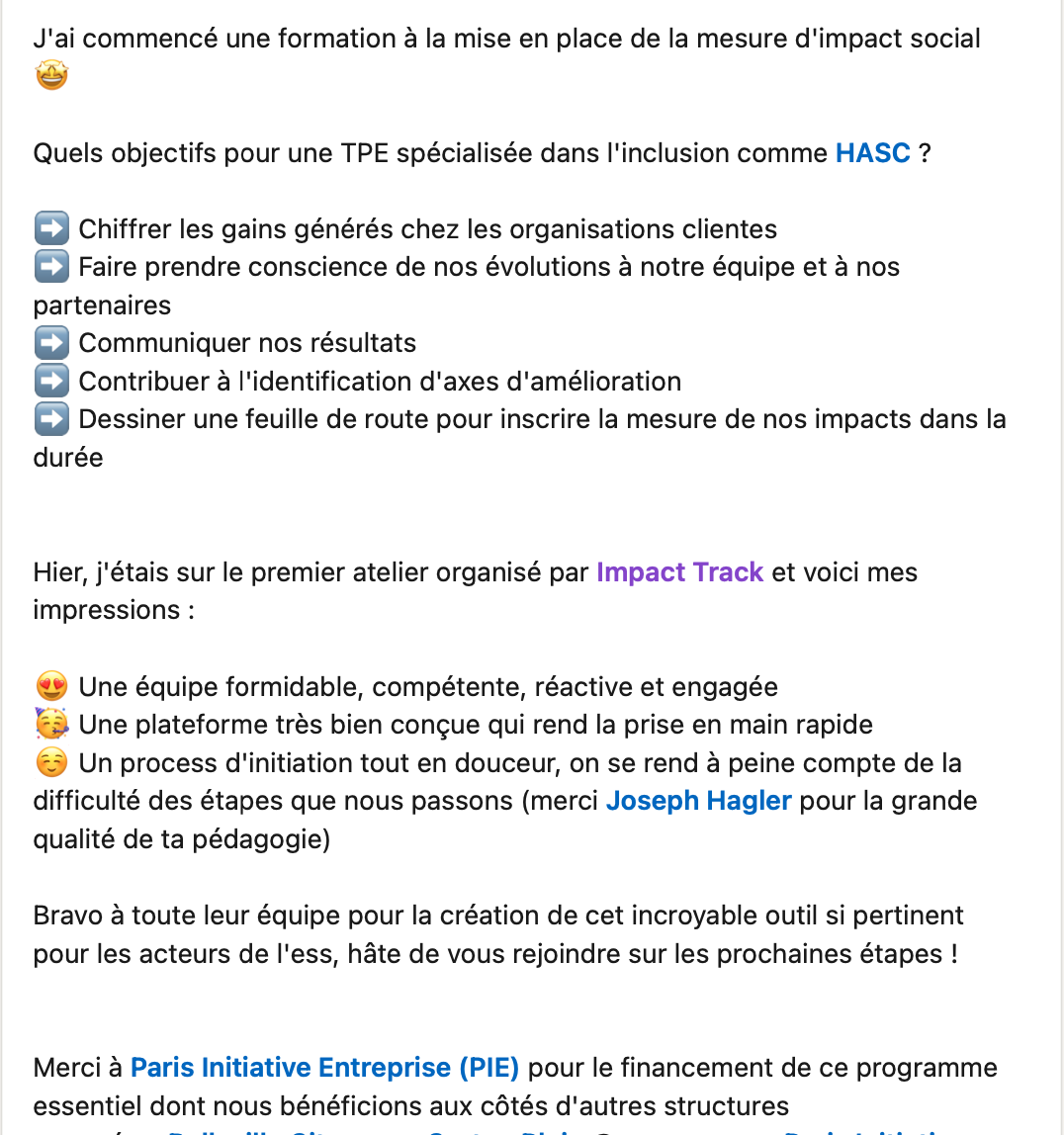 Après avoir mené sa propre mesure d’impact sur deux de ses dispositifs d’accompagnement et interrogés les entrepreneurs qu’elle accompagne, PIE a pris conscience de l’intérêt grandissant des entrepreneurs pour la mesure d’impact. En effet, la mesure d'impact est devenue un outil indispensable pour les structures de l'ESS qui souhaitent :